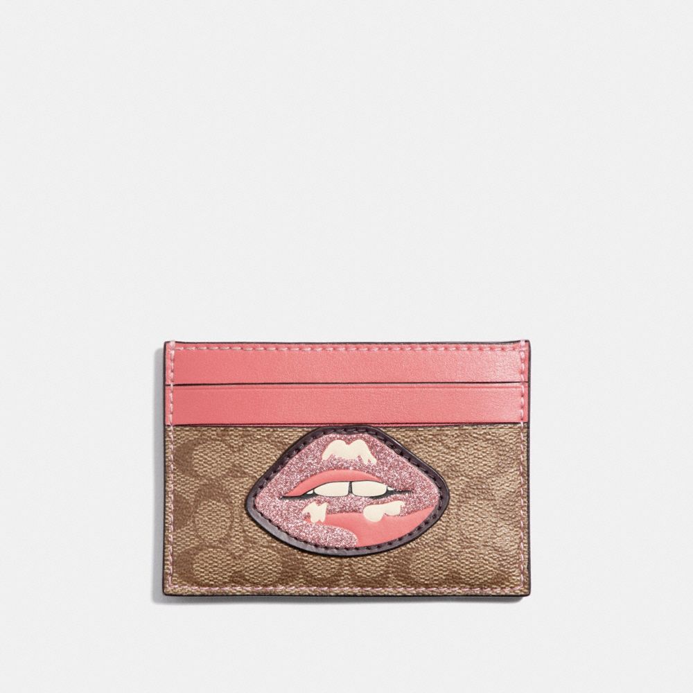 COACH F31893 CARD CASE IN SIGNATURE CANVAS WITH LIPS - KHAKI-MULTI-/SILVER